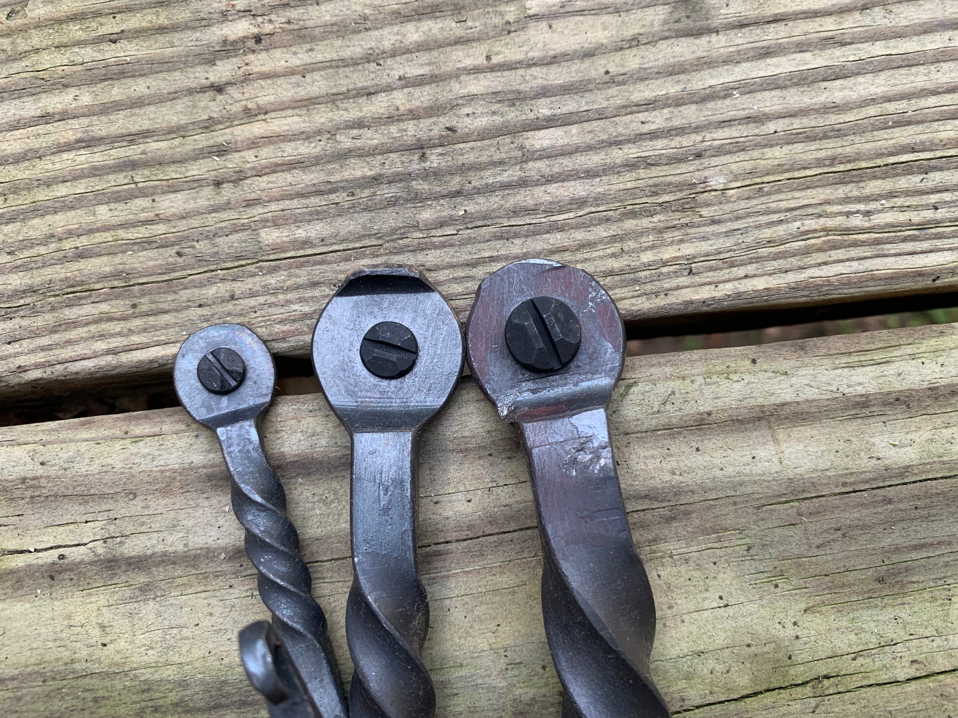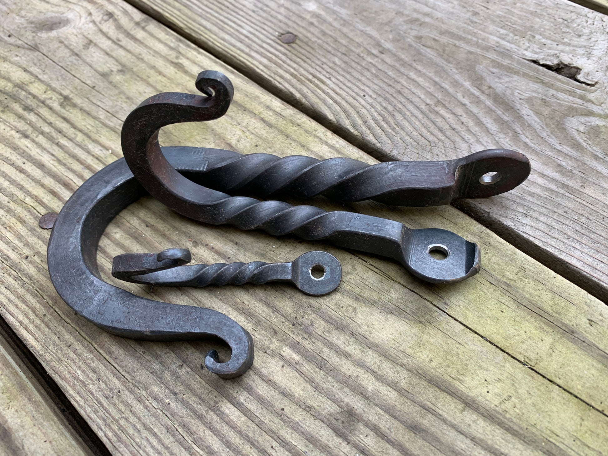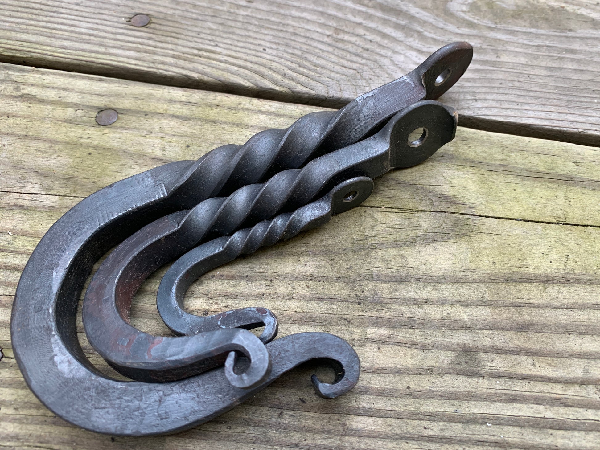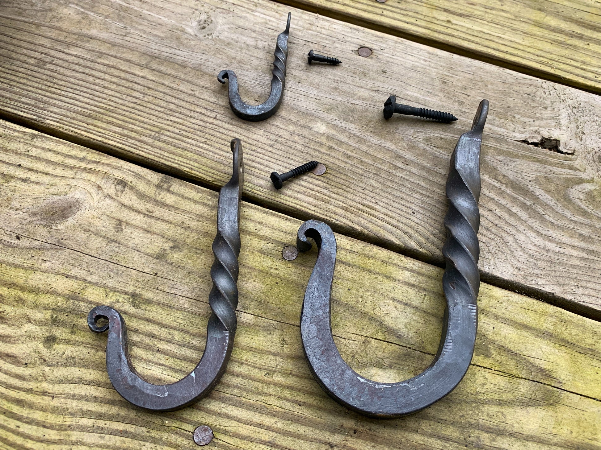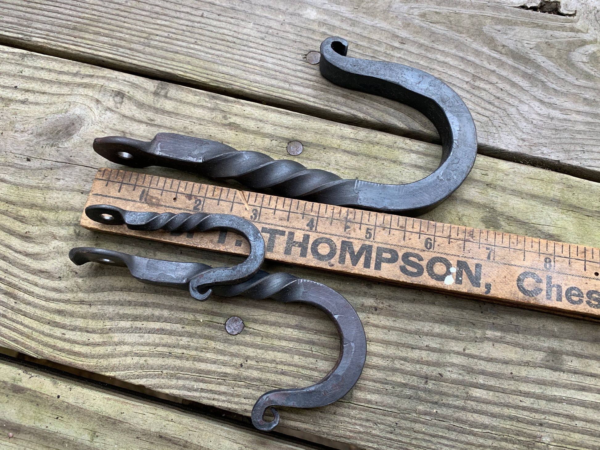 These traditional wrought iron hooks are forged by hand in New York. Please see below for measurements of each size hook. Each one is slightly different, however if you order more than one I will do my best to make a matching set.