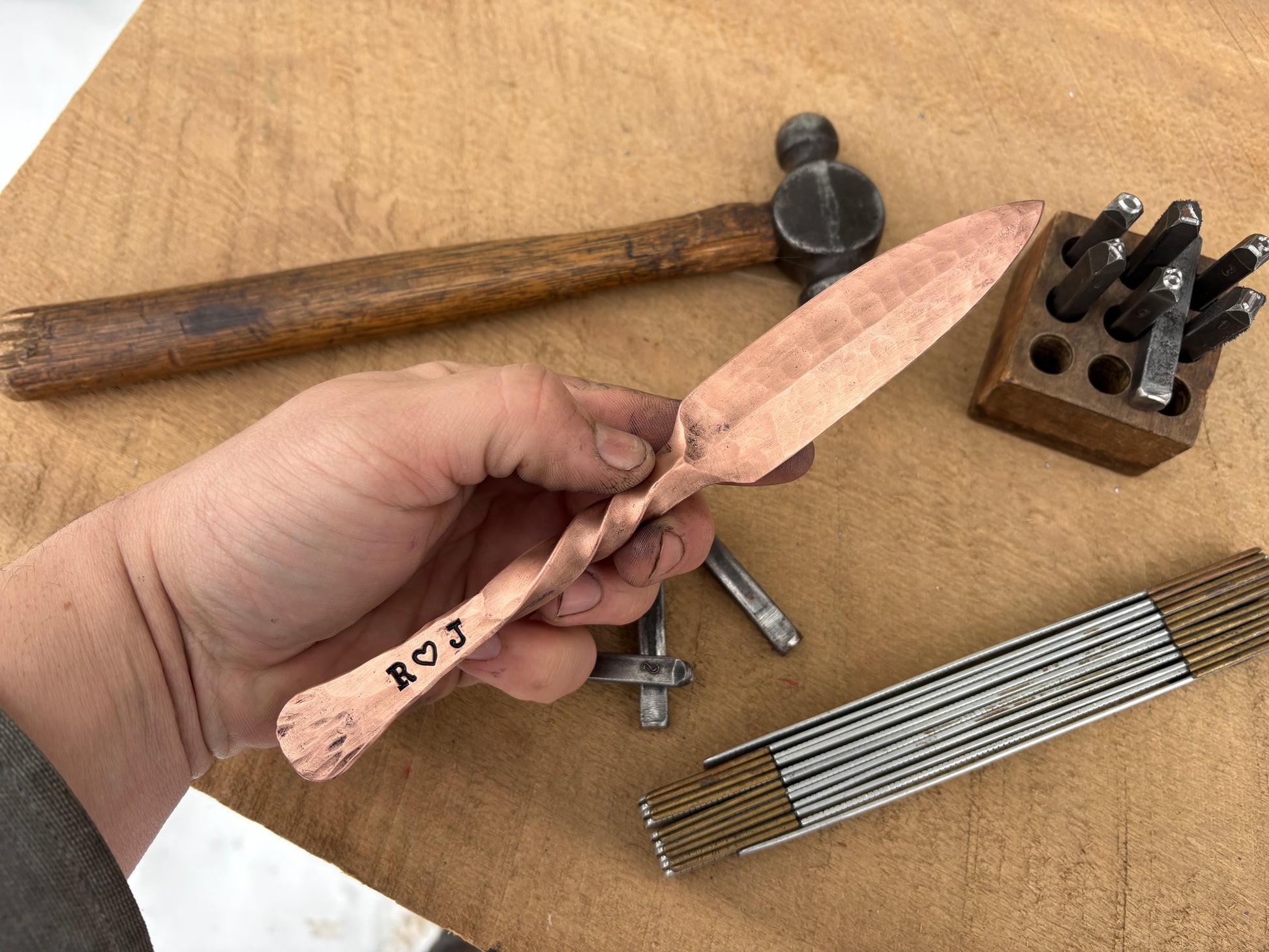 After forging, I lightly hammer the edges of the blade to "work harden" the copper, just like the ancient smiths would have done. It creates a beautiful and surprisingly durable blade. All the work that I do is with antique blacksmithing tools. Because of that, each item is one of a kind and shows all the hammer marks that come along with being hand made. The finish is a light coat of linseed oil.