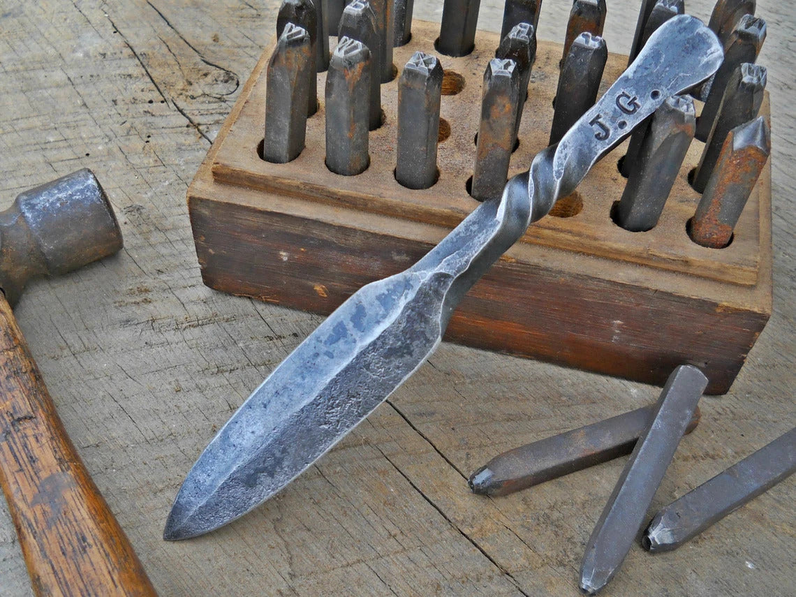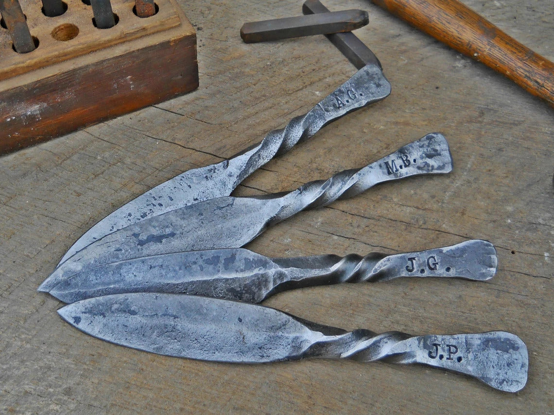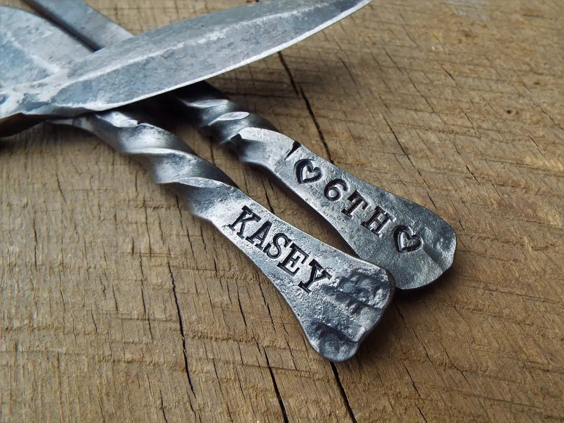 This is a hand forged letter opening knife made from 3/8 mild steel. Each one can be customized with up to 6 characters on each side! Although it is sharp, its only meant to cut letters, not being high carbon steel for a true knife or weapon. It has a beautiful finish, straight from the forge! Makes a great gift for anyone or unique wedding favors. Perfect for the Iron (6th) or steel (11th) wedding anniversaries!