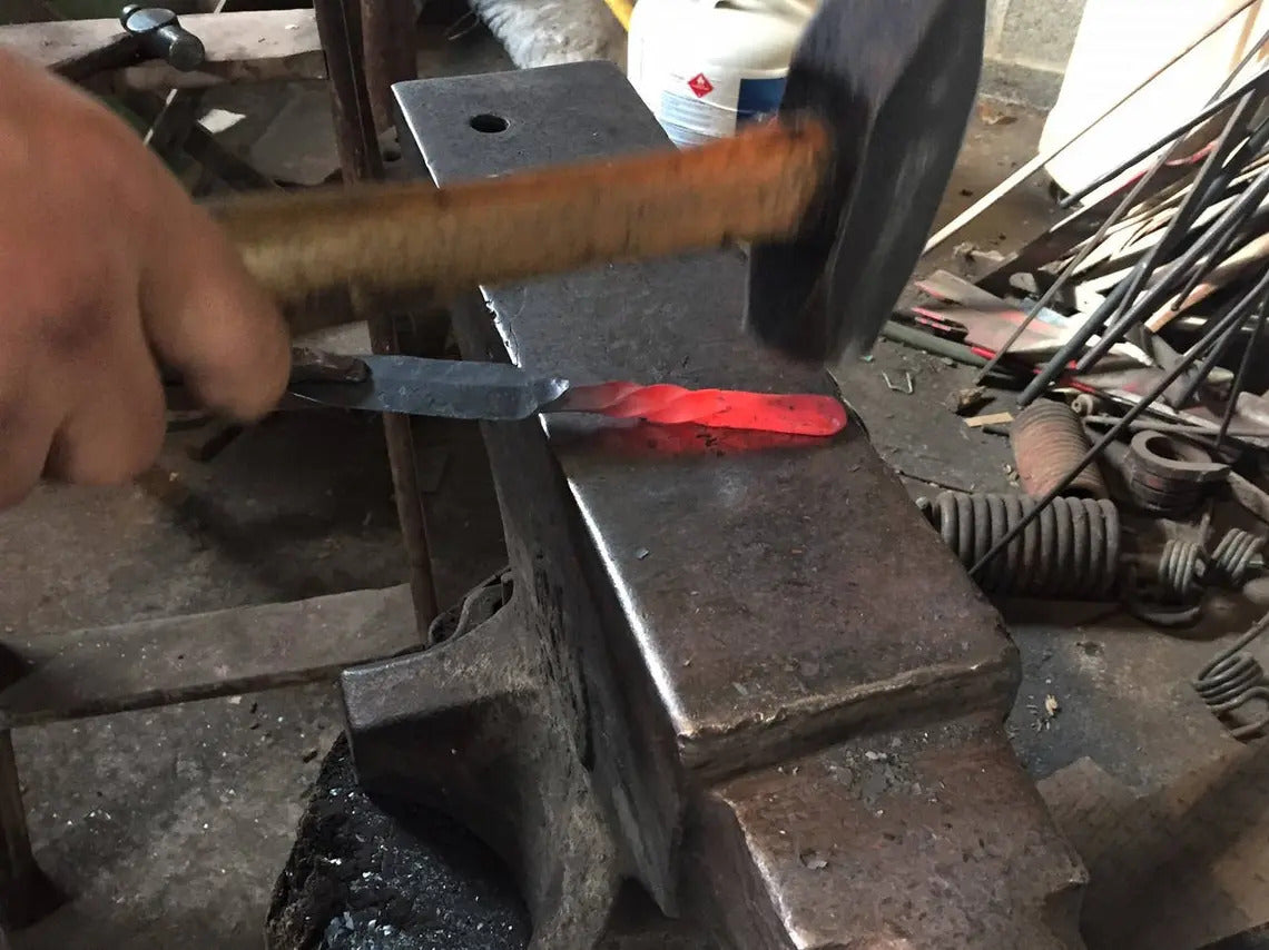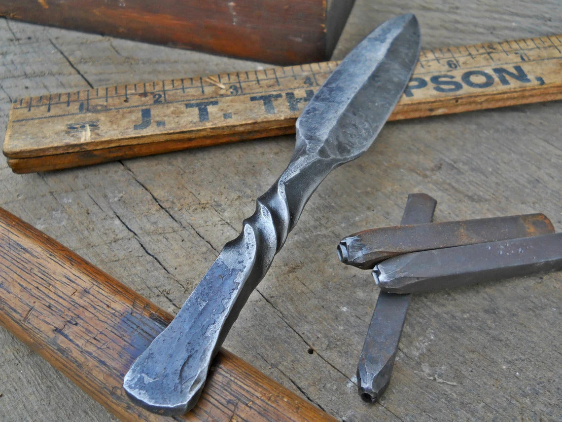 All the work that I do is with antique blacksmithing tools. Because of that, each item is one of a kind and shows all the hammer marks that come along with being hand made. The finish is a light coat of linseed oil.