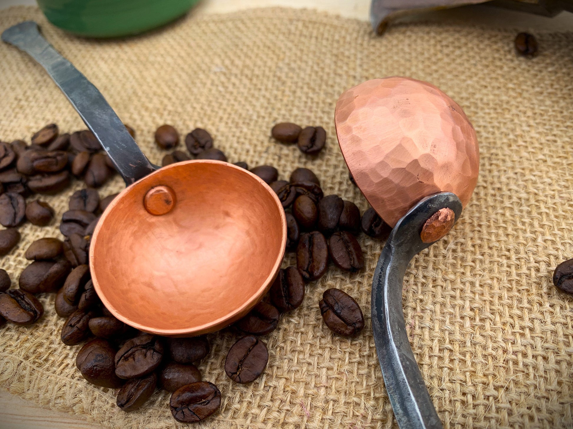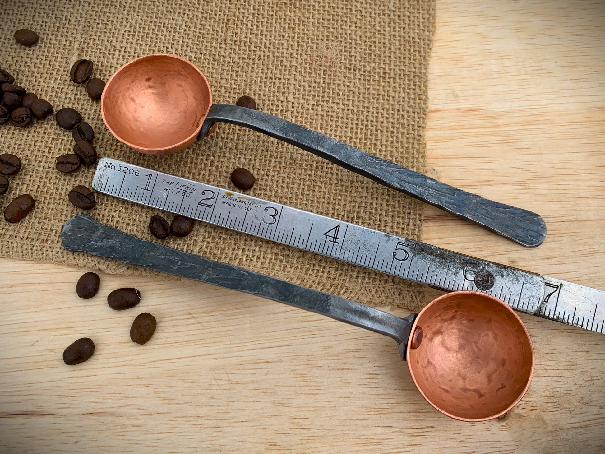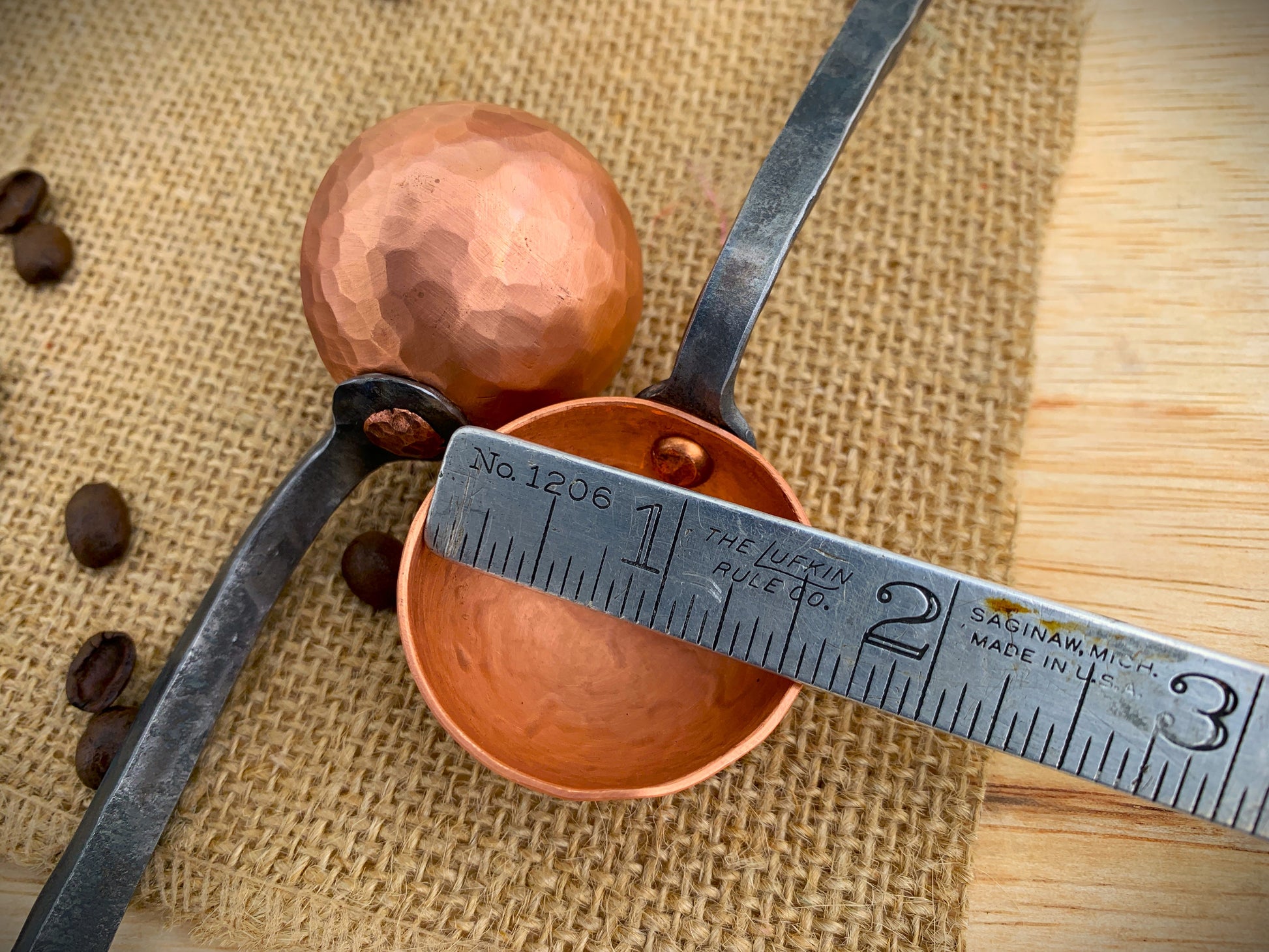 These Blacksmith made coffee scoops are completely hand made and feature the marks of the hundreds of hammer blows required to make them. They hold about one tablespoon and measure 7 inches to 8 in length. The bowl is forged out of copper. The handle is hand forged out of wrought iron, no two are perfectly alike!