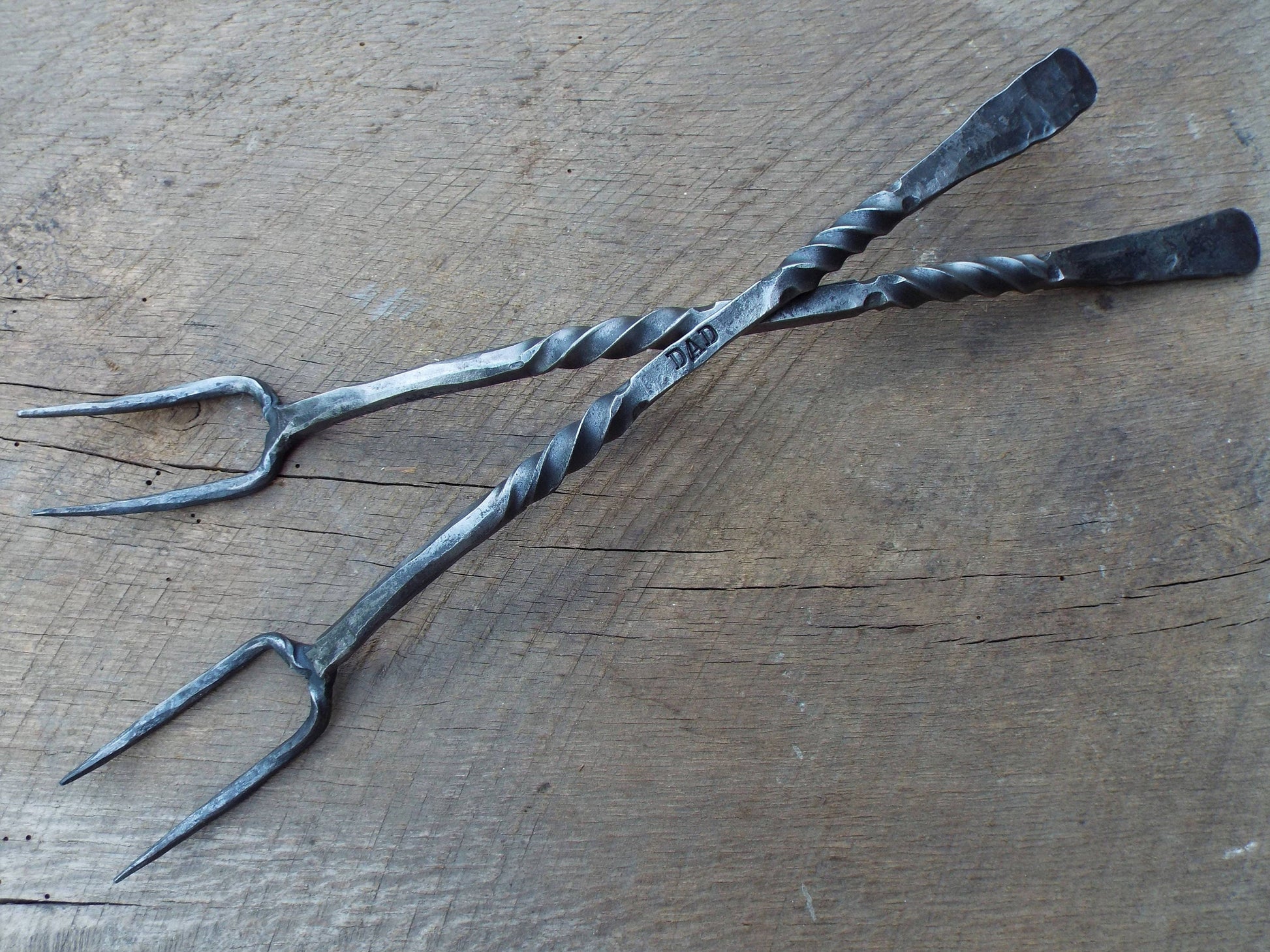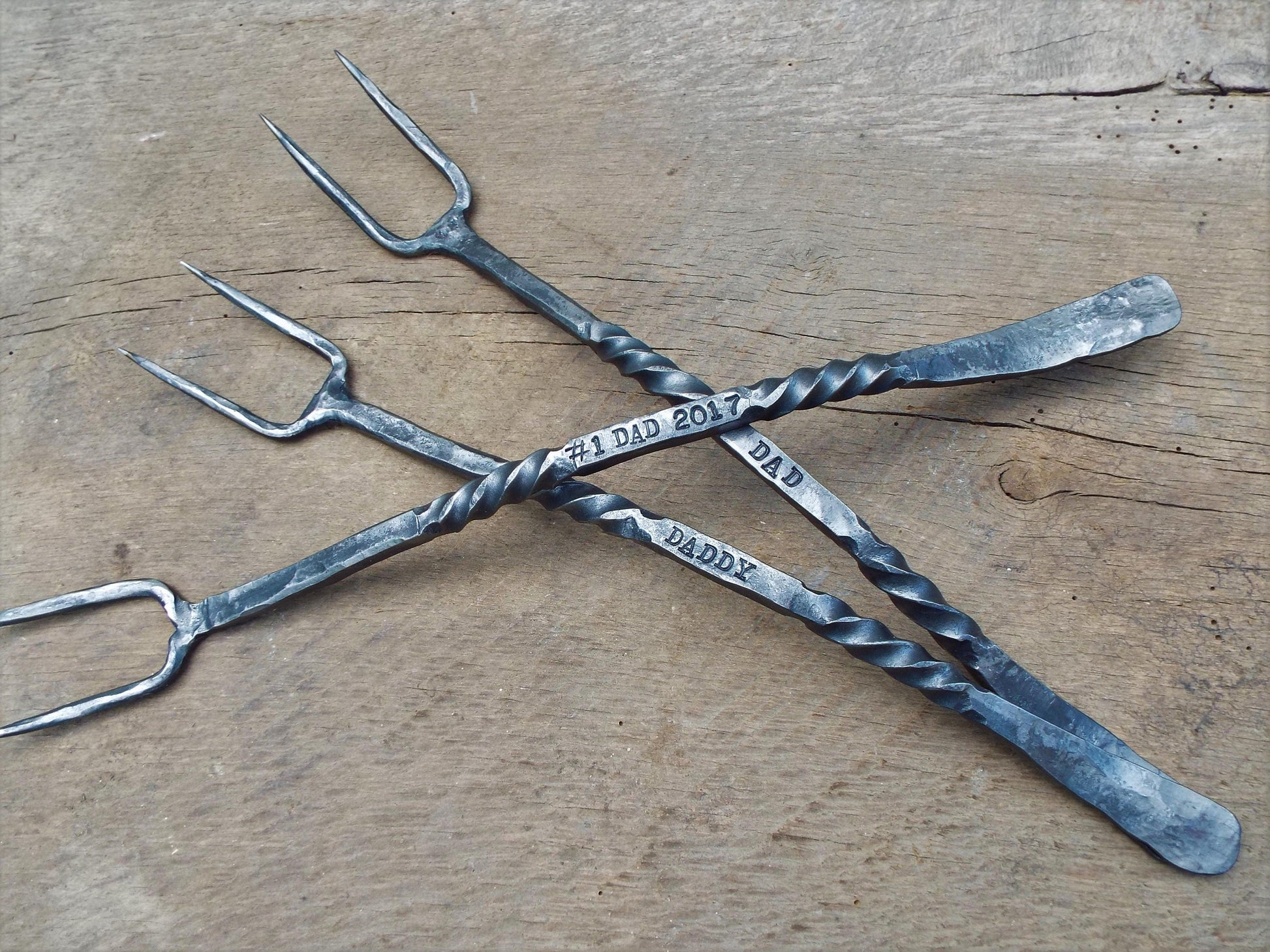 This is an awesome hand forged meat fork! Very impressive to look at and show off because each one is hand hammered out of steel. Totally functional and heirloom quality! Each one can be customized with ten characters for free.