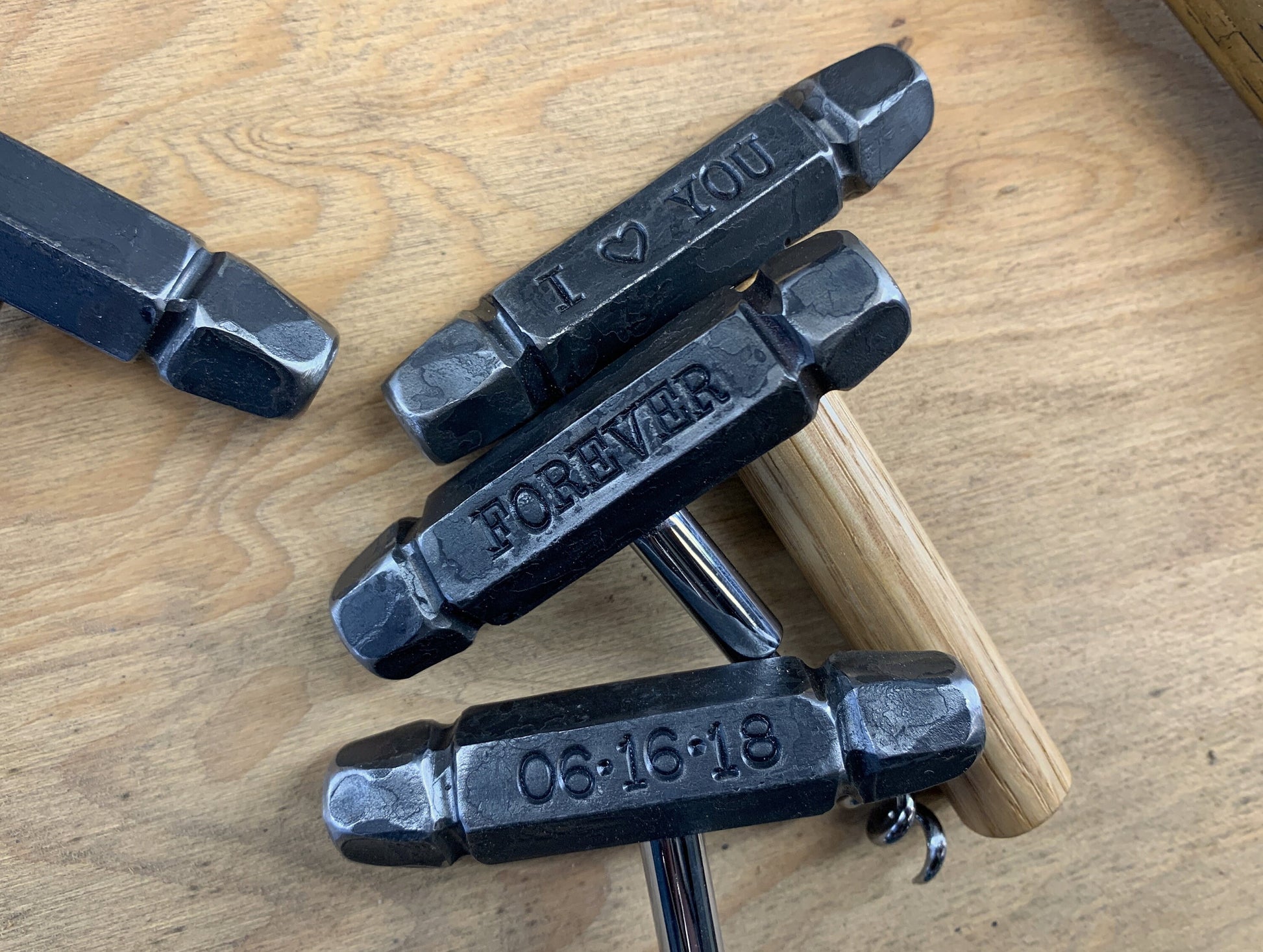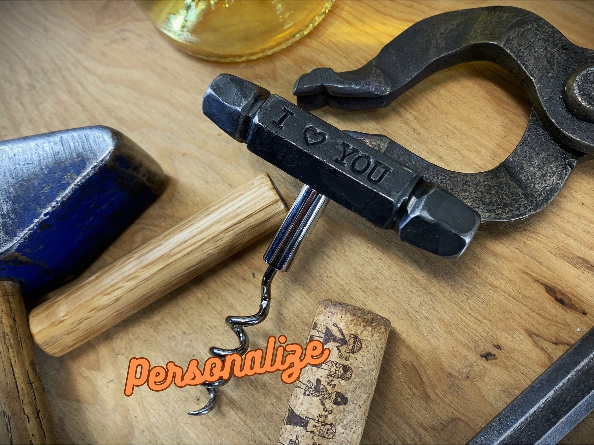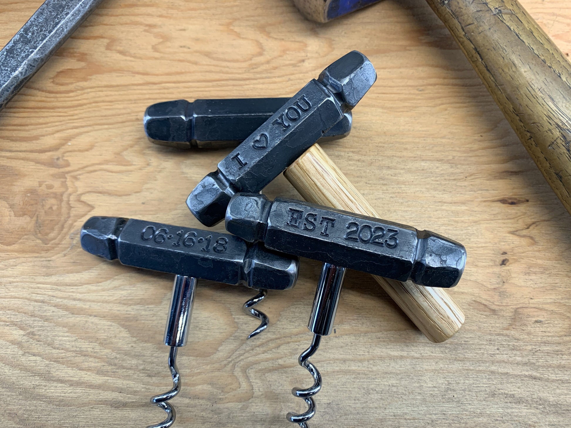 This blacksmith hand-forged corkscrew made from 5/8 inch solid iron. Each one can be personalized with eight characters front and back. These are made and stamped with antique blacksmithing tools! Because of that, each handle is one of a kind and shows all the hammer marks that come with being hand hammered. They have a wonderful feel in the hand, unlike anything you can buy in the store! These make a great 6th (iron) anniversary gift. Many people like to include a name, ♥6TH♥, tally marks or their anniversary date .