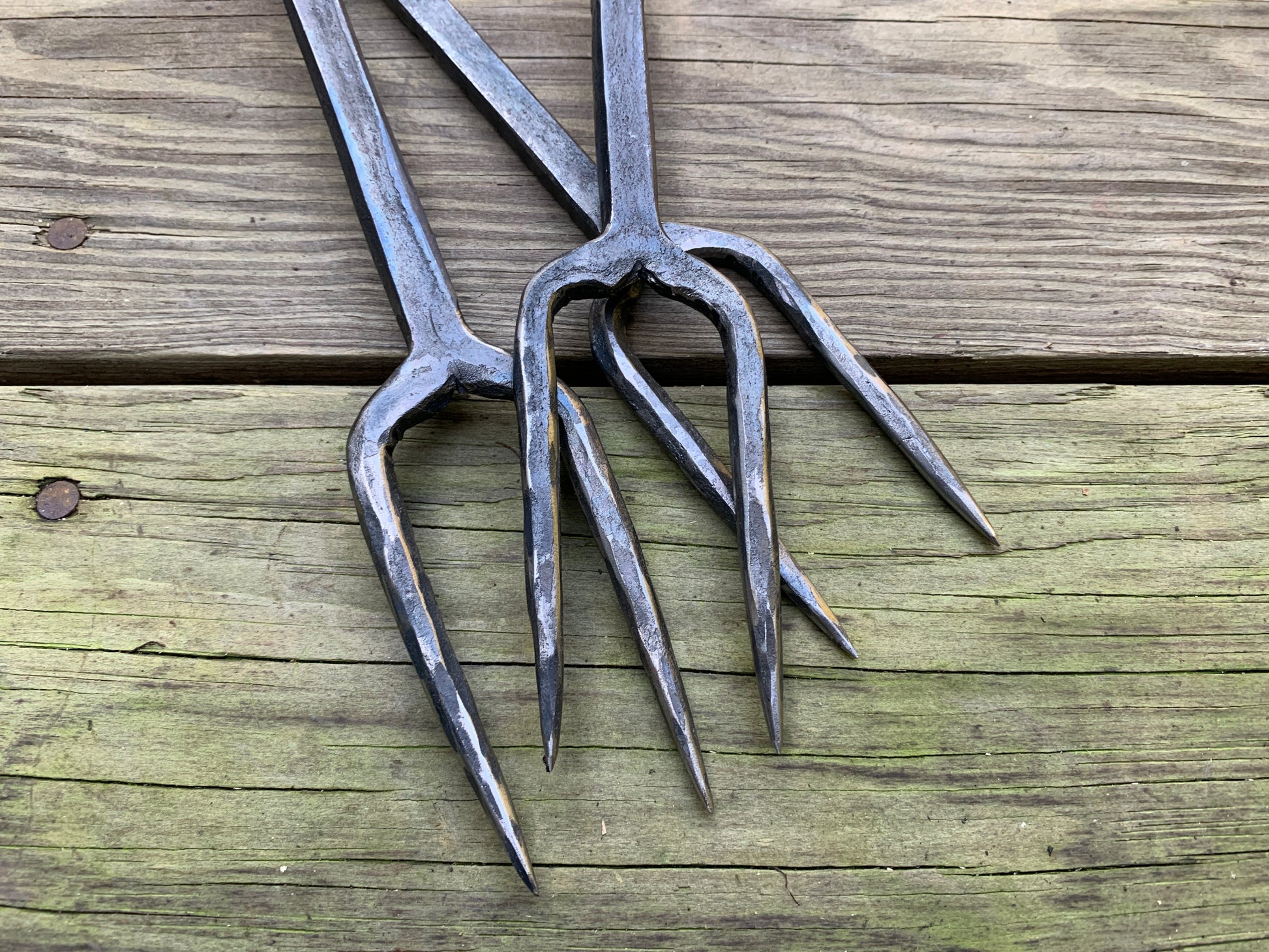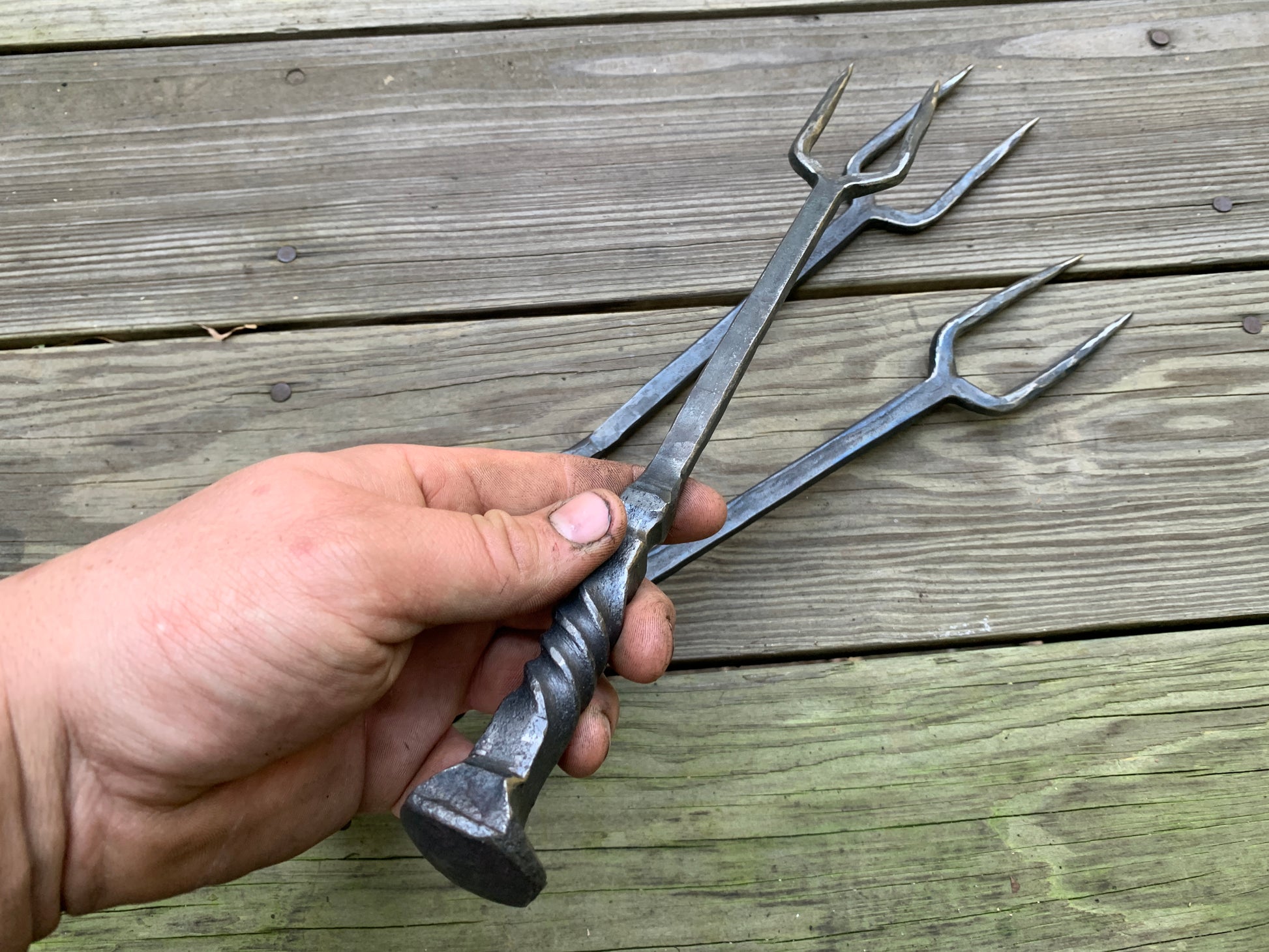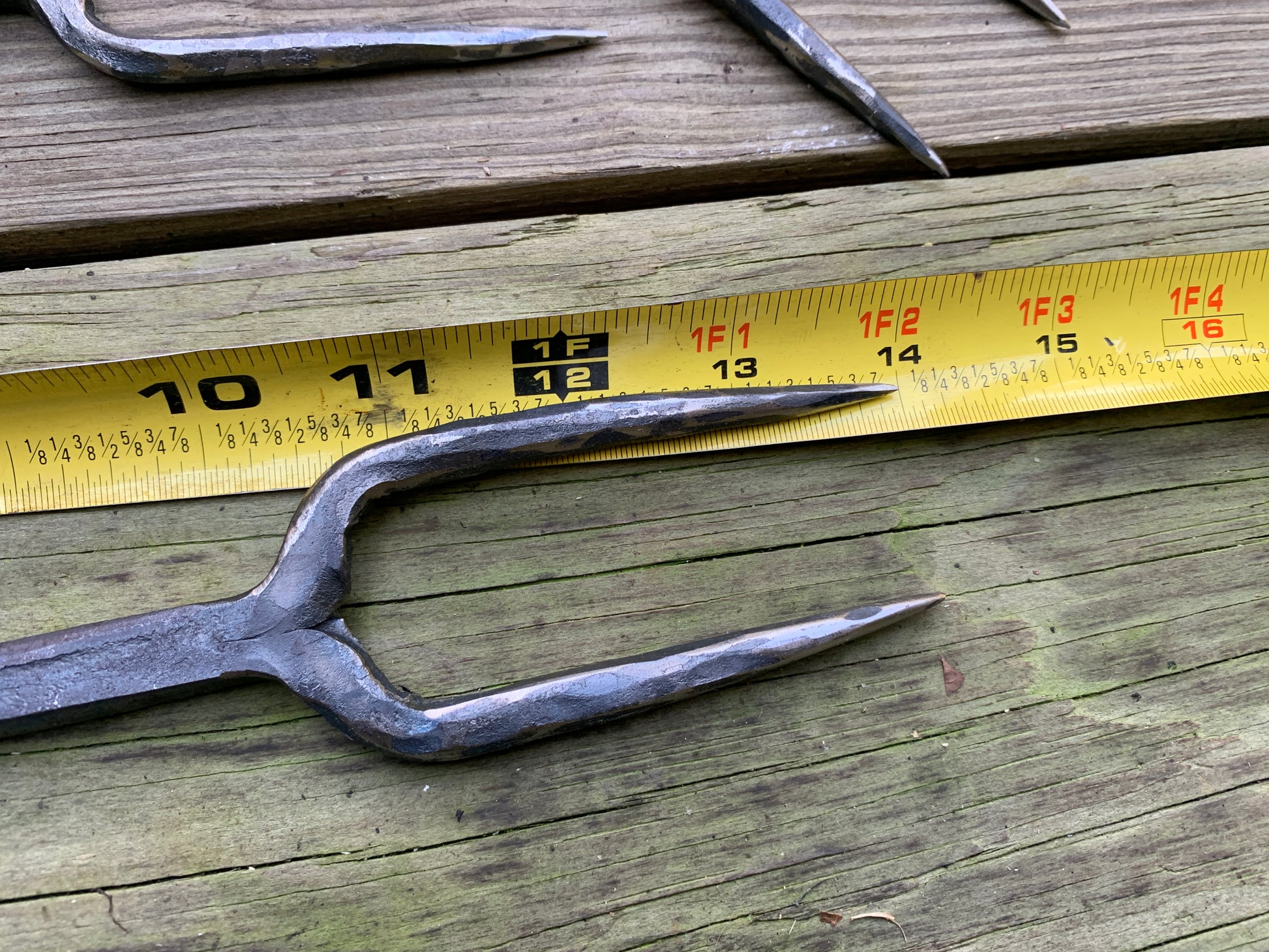 These grilling forks are hammered from a single railroad spike! They are about 14 inches long but can vary a few inches. There is an option to include a drilled hole in the handle with a leather lanyard for hanging. (It should be kept out of direct weather).